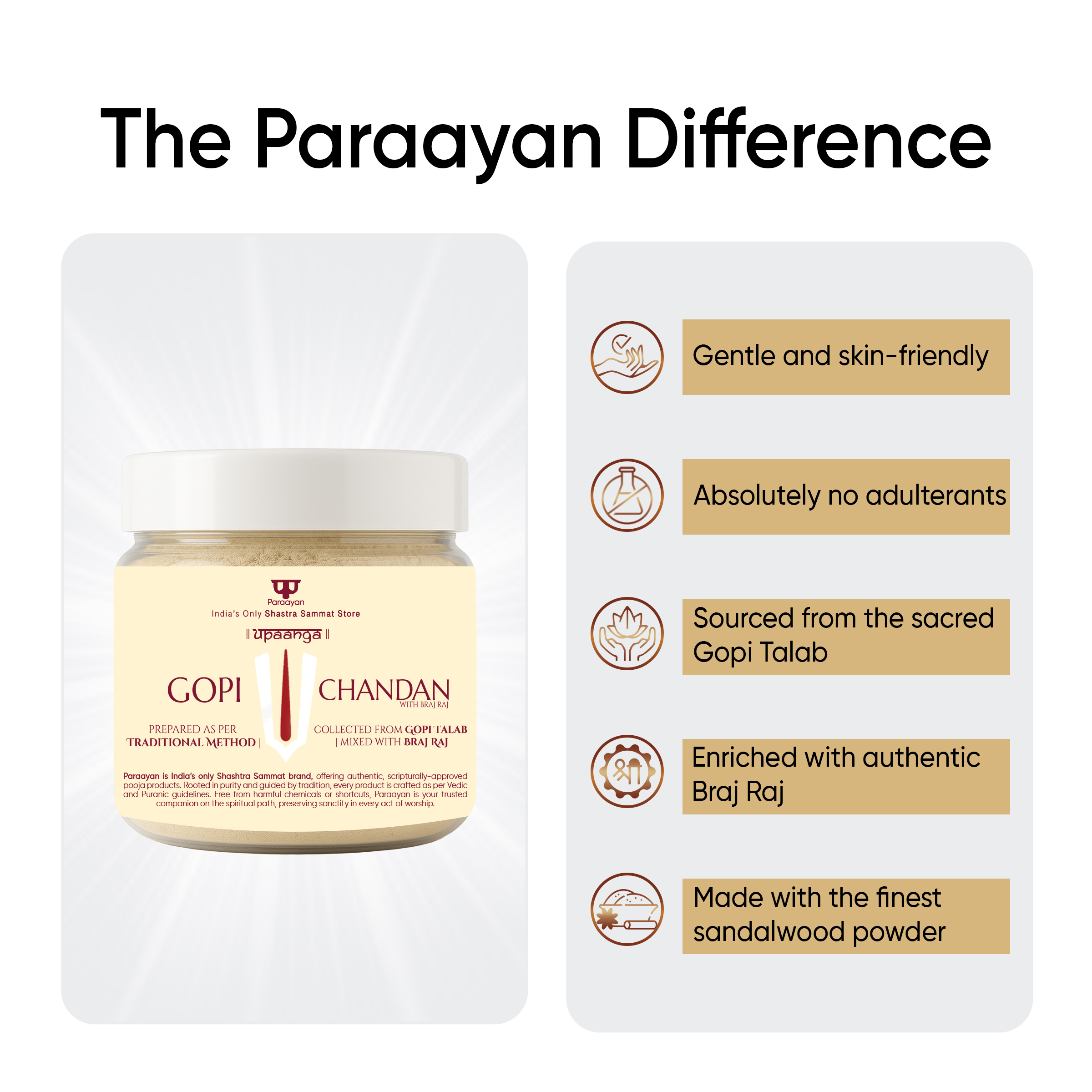 - Symbol of Devotion & Protection: Applying Paraayan Gopi Chandan aligns the mind with sattva, offering spiritual protection and deepening one’s devotional connection.