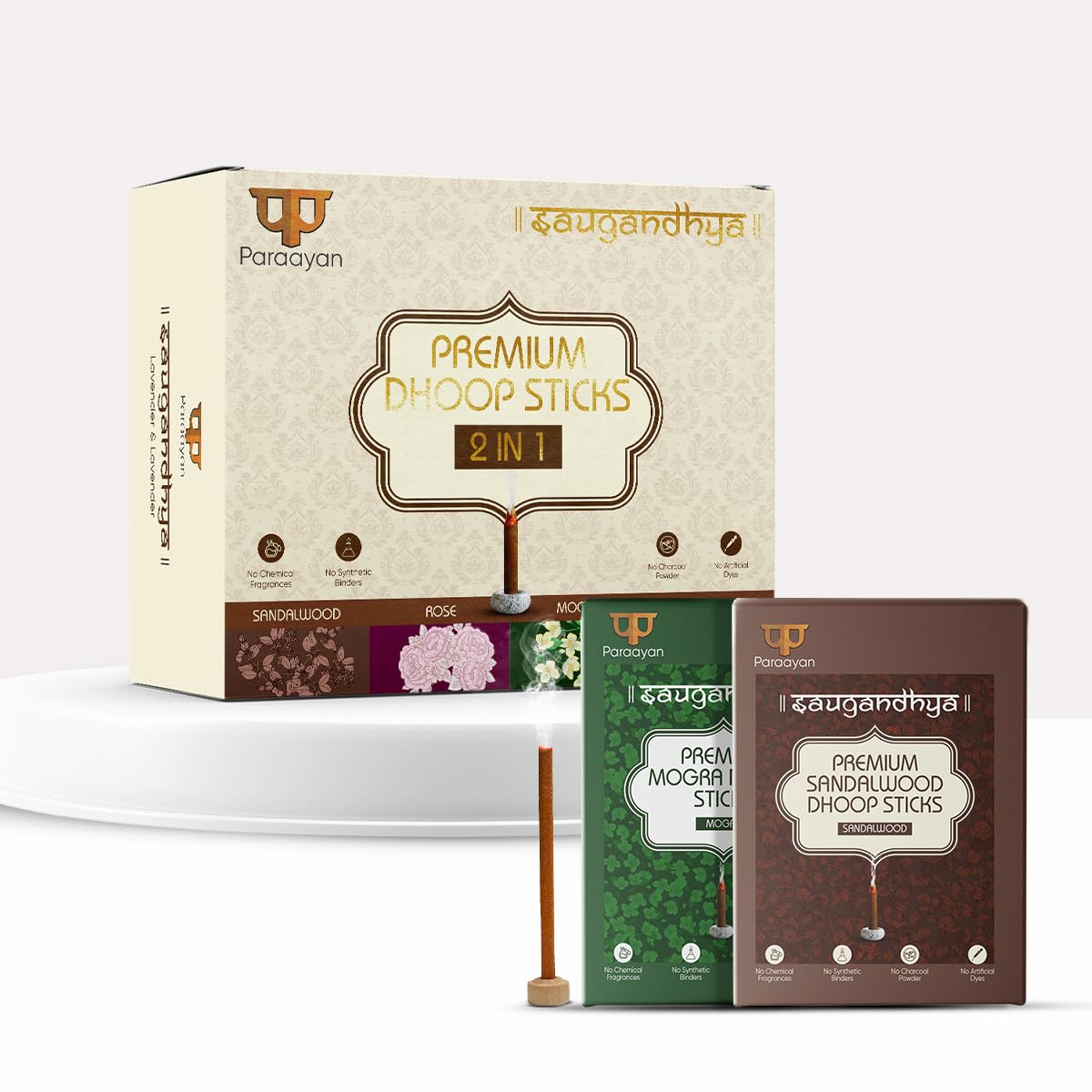 Paraayan Saugandhya Dhoop Sticks (Sandalwood – Mogra Combo) | 1 Pack, 2 Boxes, 20 Sticks Each