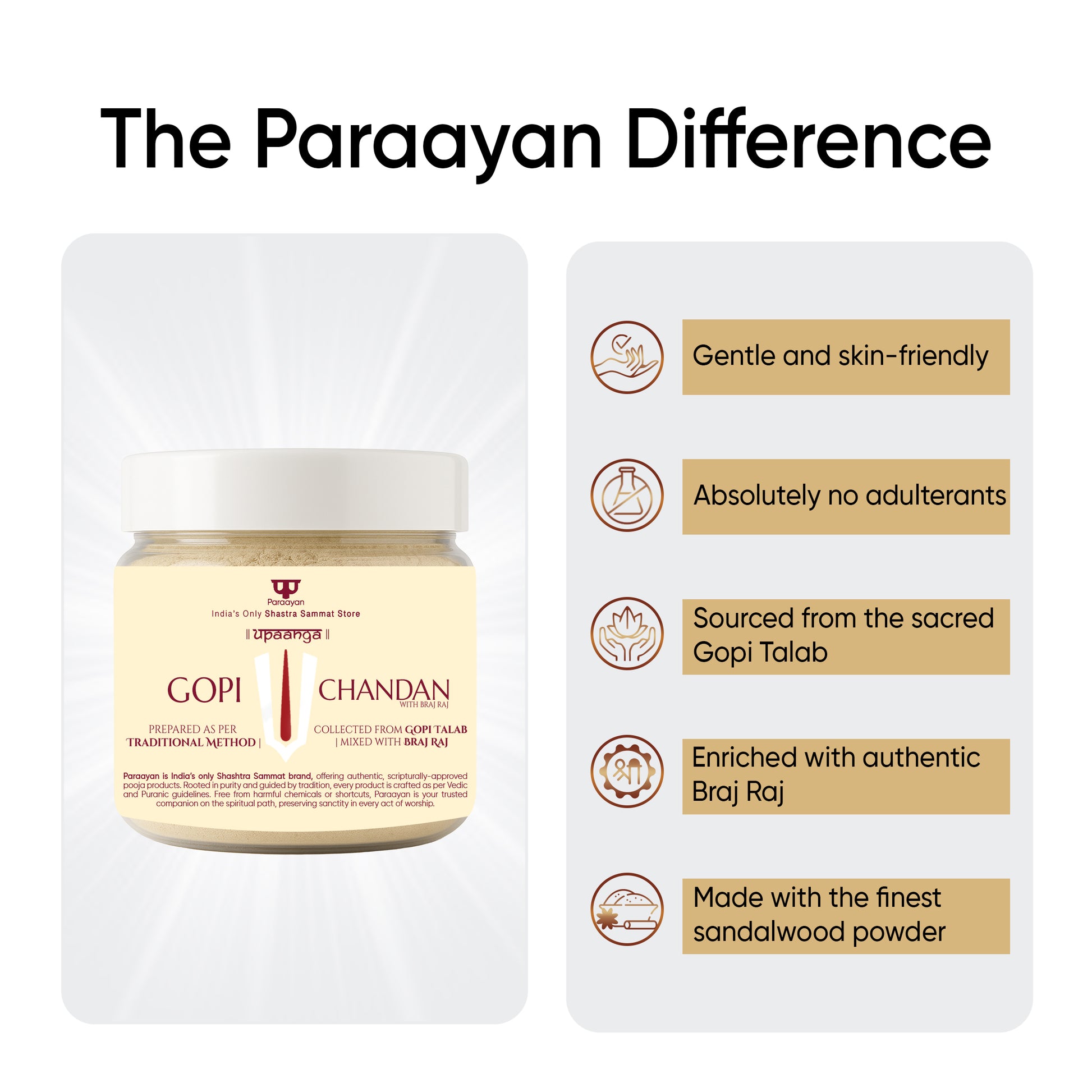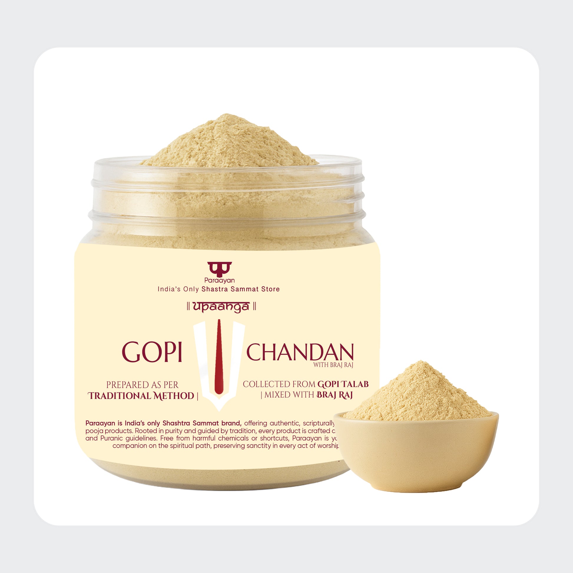 Paraayan Gopi Chandan is crafted for devotees who seek purity and tradition in their daily sadhana. Made by blending authentic Gopi Talab clay with premium sandalwood powder and pre-mixed with sacred Braj Raj from Raman Reti, it carries natural cooling and sattvic qualities that calm the mind during prayer and meditation. When applied as Urdhvapundra, it symbolizes devotion and surrender to Bhagwan Krishna, shielding the wearer from negativity and aligning their inner energy with divine vibrations.
